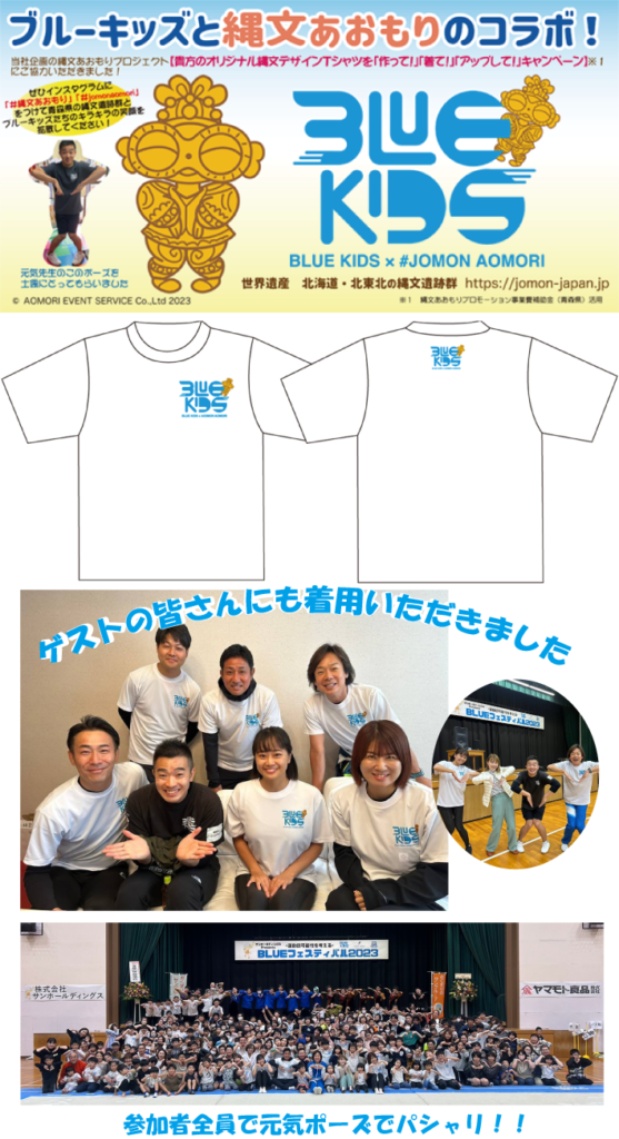 2023年10月、ブルーフェスティバルにおいて、主催のブルーキッズ様がTシャツを制作していただきました!デザインは先生考案のポーズを土偶キャラにとらせてチームロゴとコラボさせたものです。大変かわいらしく仕上がりました。